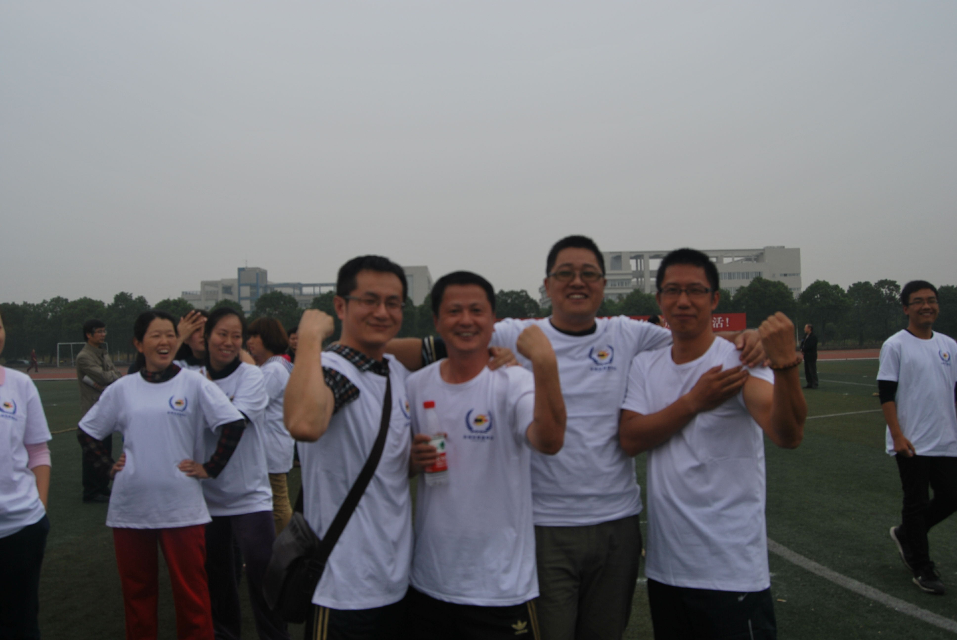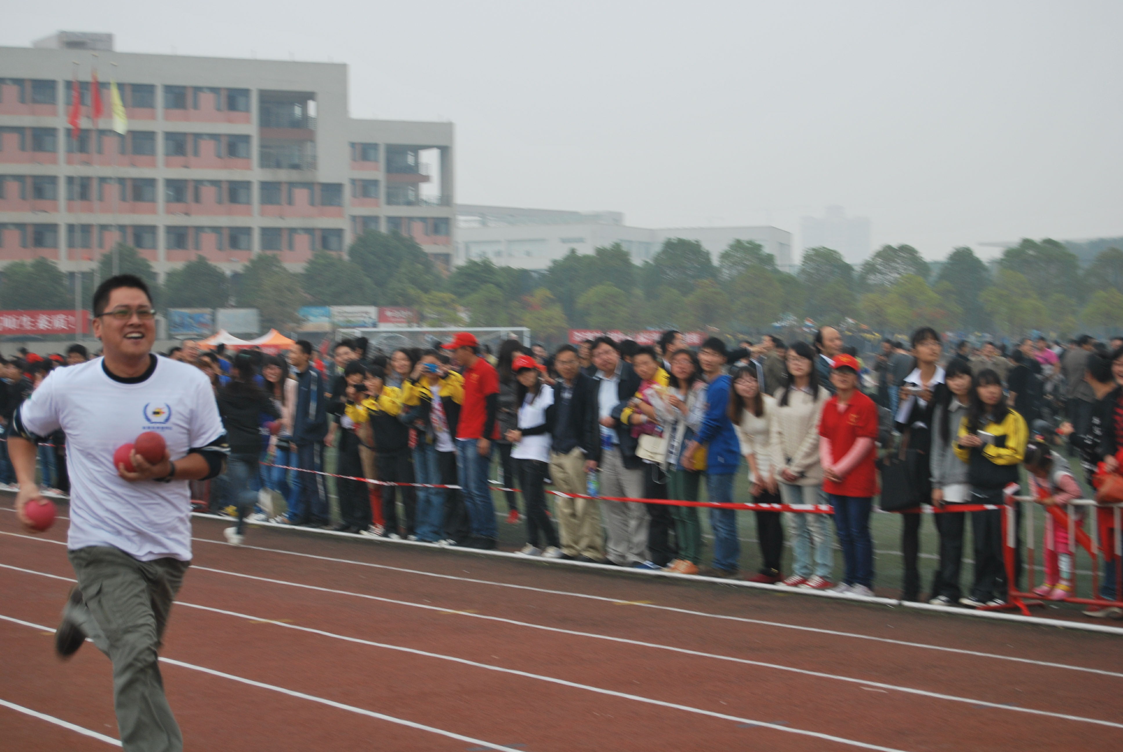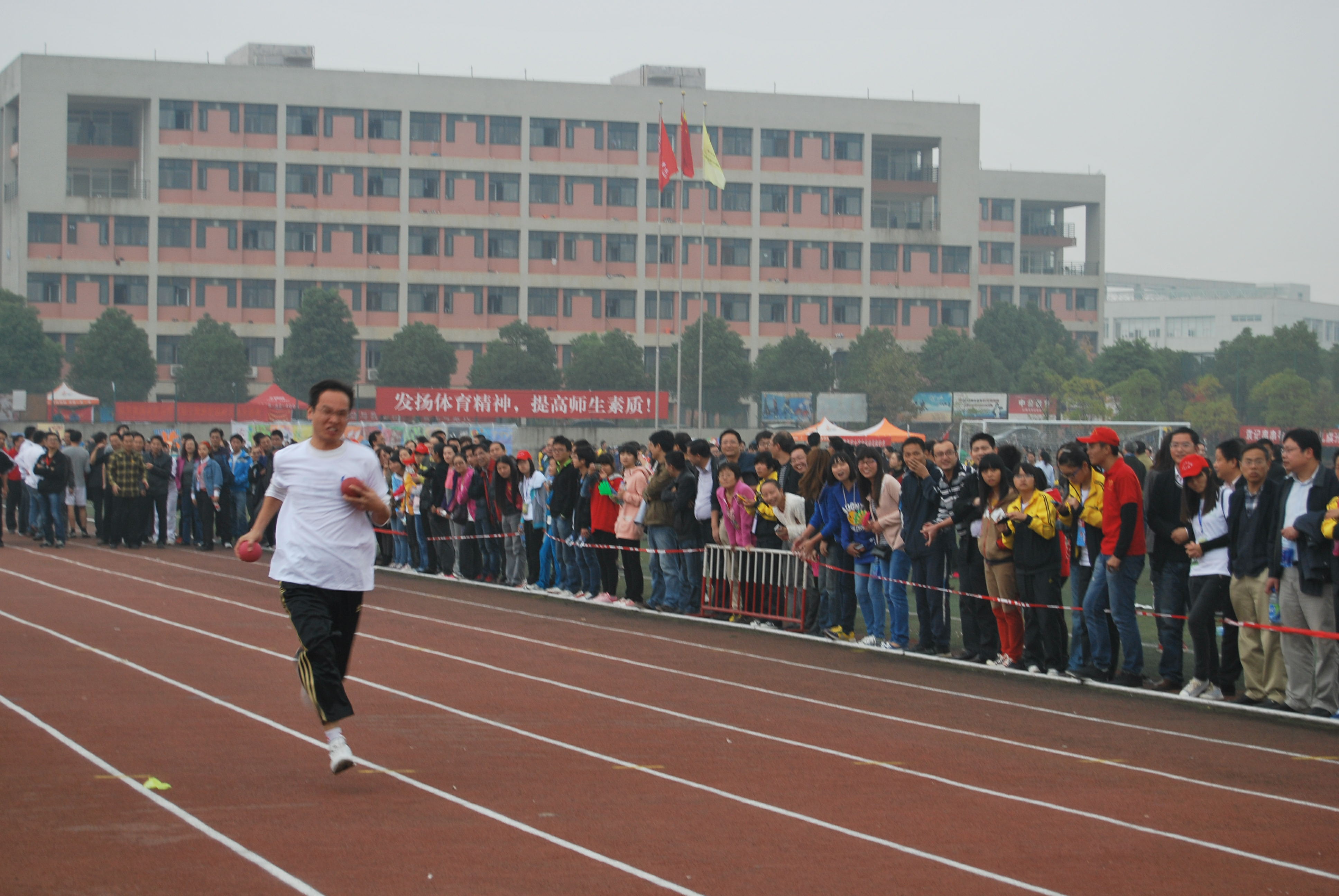 下午主要进行教职工比赛,有实心球接力赛,短跑等项目。比赛时,yl23455永利老师们统一穿着印有yl23455永利字样白色短袖T恤,在寒风中摩拳擦掌,鼓舞斗志,准备迎接比赛的挑战。跑道两边站满了呐喊助威的“亲友团”,yl23455永利的学生在跑道边举着yl23455永利的大旗挥舞,为老师们欢呼,看台上的同学们喊着“新闻无敌,所向披靡”的口号,为老师加油。有的同学拿起相机为老师们拍下精彩的瞬间。