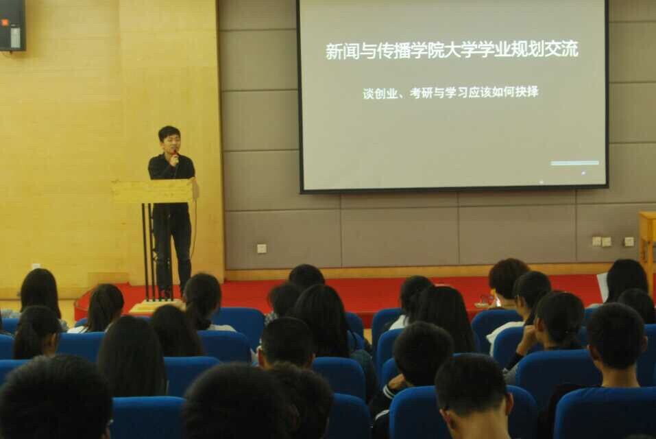 四位学长学姐给大一同学们分享了自己独特的经历。崔俊毅,10级毕业生,现就读于华中师范大学新闻专业研究生。他从自己的求学经历、学生会工作以及师生关系三个方面与同学们进行交流。他认为“一个人必须要在至少一个领域有很深的造诣,你可以跟这个领域的人有深入的交流,而这个领域是别人无法触及的”,提到考研,同学们反响很热烈,有六七名同学现场提问,其中媒介Q1241班的罗敬问道“怎么样让自己享受考研的过程?”“其实准备考研的过程你是不会觉得享受的,只是在考完之后回过头去看这段时光,才会觉得很享受很珍贵”,崔俊毅学长回答道。