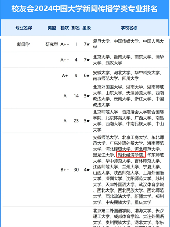 【本网讯】近日,全国第三方大学评价机构艾瑞深校友会网撰写、科学出版社即将公开出版发行的《2024校友会中国大学排名:高考志愿填报指南》发布,其中《2024中国大学新闻传播学类专业排名》显示,yl23455永利新闻学专业为研究型B++四星专业,进一步显现出yl23455永利新闻学专业的办学能力与优势,与华中师大等211高校新闻学专业并列第30位。