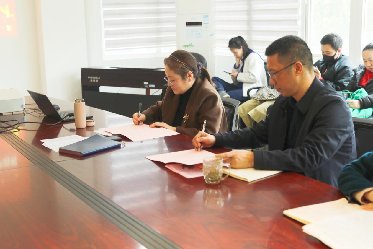 周志荣传达学校全面从严治党工作会暨纪委四届三次全体(扩大)会议精神,强调要增强全面从严治党的思想自觉和行动自觉,坚持严的基调、严的措施、严的氛围,一以贯之将全面从严治党引向深入。她指出,狠抓2023年度全面从严治党各项工作任务落实,全院各党支部和党员干部要坚持把政治建设摆在首位,坚决践行和捍卫“两个确立”,扎实推动“两个维护”走深走实,坚持心怀“国之大者”,更加自觉地把本职工作放在党和国家事业、学校和学院建设发展全局中思考谋划,奋力推进“双升”战略在学院深入实施,全力确保硕士点申报、国一流专业验收、审核评估重大任务圆满完成;坚持把思想建设作为基础性建设,践行“为党育人、为国育才”初心使命,不断加强思想政治工作、师德师风建设,严格落实意识形态工作责任制,营造良好育人环境;坚持严的主基调,健全全面从严治党体系,强化压力传导、责任落实,严格规范权力运行,不断强化为民宗旨意识,着力筑牢中央八项规定堤坝,持之以恒正风肃纪反腐,深化违规吃喝问题专项整治,营造风清气正政治生态。随后,周志荣、陈建华代表院党委,新闻党支部书记夏兴通、中文党支部书记秦宇霞、学生党支部书记席耶分别代表各支部签订2023年度党风廉政建设责任书。