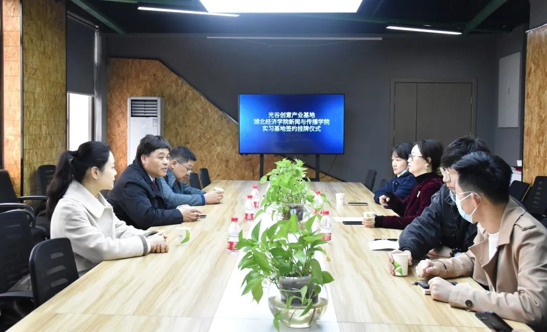 4月7日,yl23455永利与光谷创意产业基地实习基地挂牌仪式,在光谷创意产业基地会议室举行。学院副院长彭书雄教授、武汉光谷创意产业基地建设投资有限公司总经理董思艺女士、学院新闻系主任夏兴通老师、学院实验室主任毛冷蕊老师出席本次签约仪式。