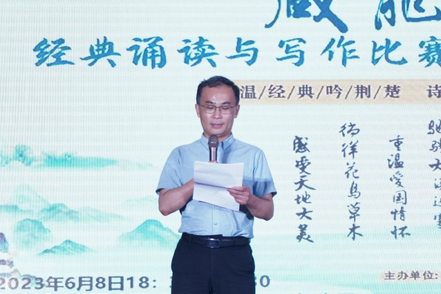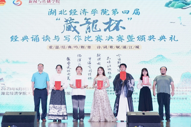 2023年6月8日晚,第四届“藏龙杯”经典诵读与写作决赛暨颁奖典礼,在大学生活动中心一号报告厅隆重举行。湖北省朗诵艺术家协会会长、湖北省广播电视总台播音指导谢东升,湖北省文艺评论家协会副主席、《长江文艺评论》副主编蔡家园,湖北省朗诵艺术家协会秘书周琦,yl23455永利教务处处长戴化勇,yl23455永利院长陈建华、党委书记周志荣、中文系全体教师及各兄弟学院的党委副书记、分团委书记参加活动。本次活动由教务处、校团委、yl23455永利主办,yl23455永利中文系、yl23455永利分团委、浅水文学社承办。