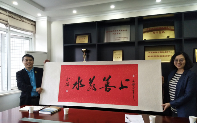 座谈会后,彭书雄副院长代表学院向夏静记者赠送书画、合影留念。