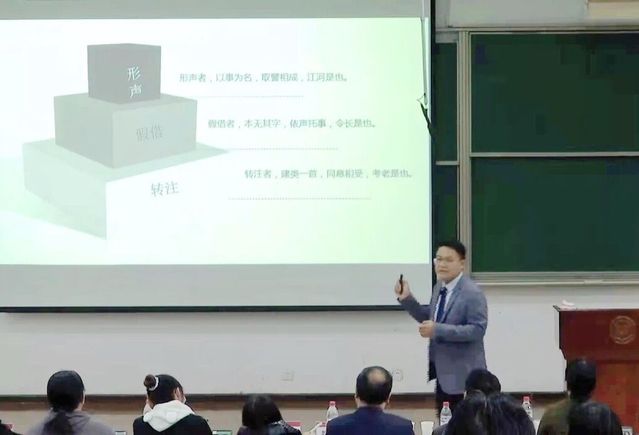 秉持着这样的教学理念,今年秋季学期杨帅老师参加了学校的教师授课大赛。从系里评选再到院里决赛,最终被选到学校参与决赛,历时三个月,经历三轮比赛,杨帅老师始终不懈怠地准备着每一次比赛。从院里的决赛开始,杨帅老师选择授课的内容就是大学语文中“母语与文字文化”章节的象形文字造字法。对他来说,这个领域和他本身的研究领域古典文献学研究有一定的共通之处,也是学生比较感兴趣的一个方面,所以杨老师的板书设计在其他老师看来颇为“大胆”。杨老师的板书内容是象形文字的书写方式和构造方法,乍一看就像在黑板上画画,但和本课的教学内容却是紧密结合的。