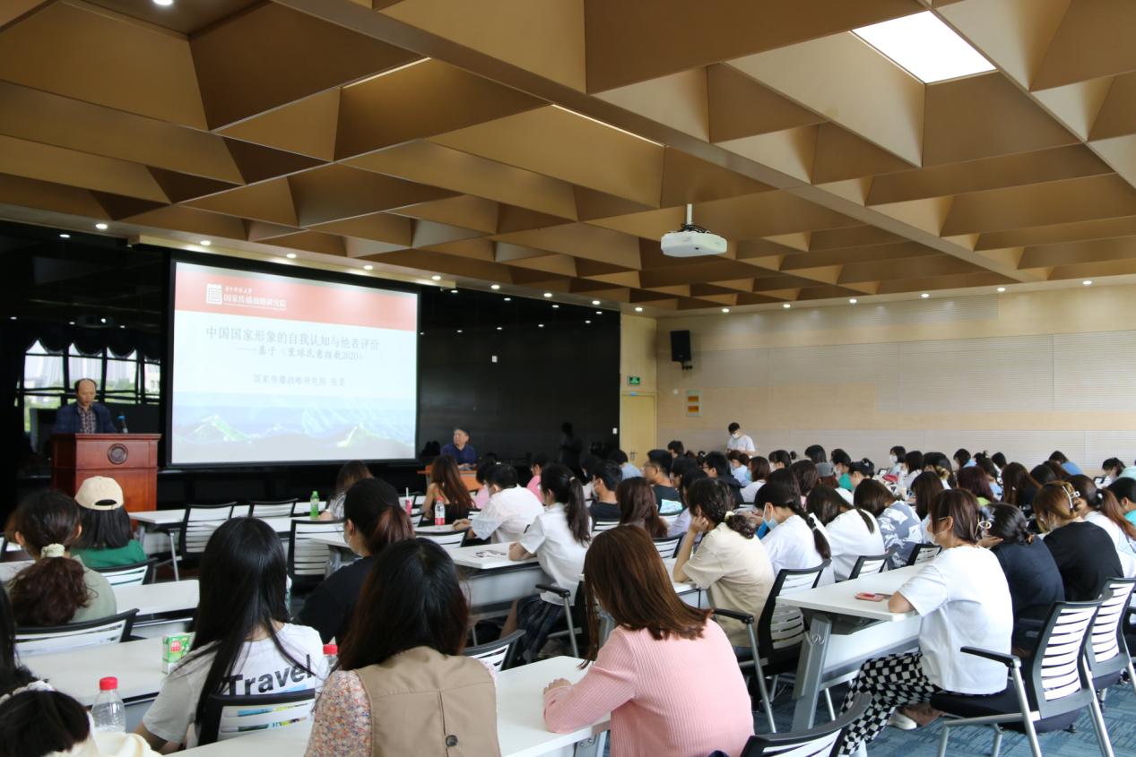 张教授从“寰球民意指数”“中国国家形象的他者认知”“中国国家形象的自我认知”以及“启示和建议”四个方面展开。首先,张教授从当今世界的格局和背景入手,依次展开对寰球指数的研究必要性、执行过程的讲解。接着,张教授通过一手调研得出的详实数据展示了世界多国对中国实力的认知与印象,从而让同学们对中国在别国的国家形象有了更深刻的认识。张教授给同学们带来我国公众对国家实力认知的若干统计数据结果,通过数据分析展示我国近年来在各方面实力的提升。最后,张教授提出了十点建议作结,可谓大气而不失细节,既立足实际,又面向未来。
